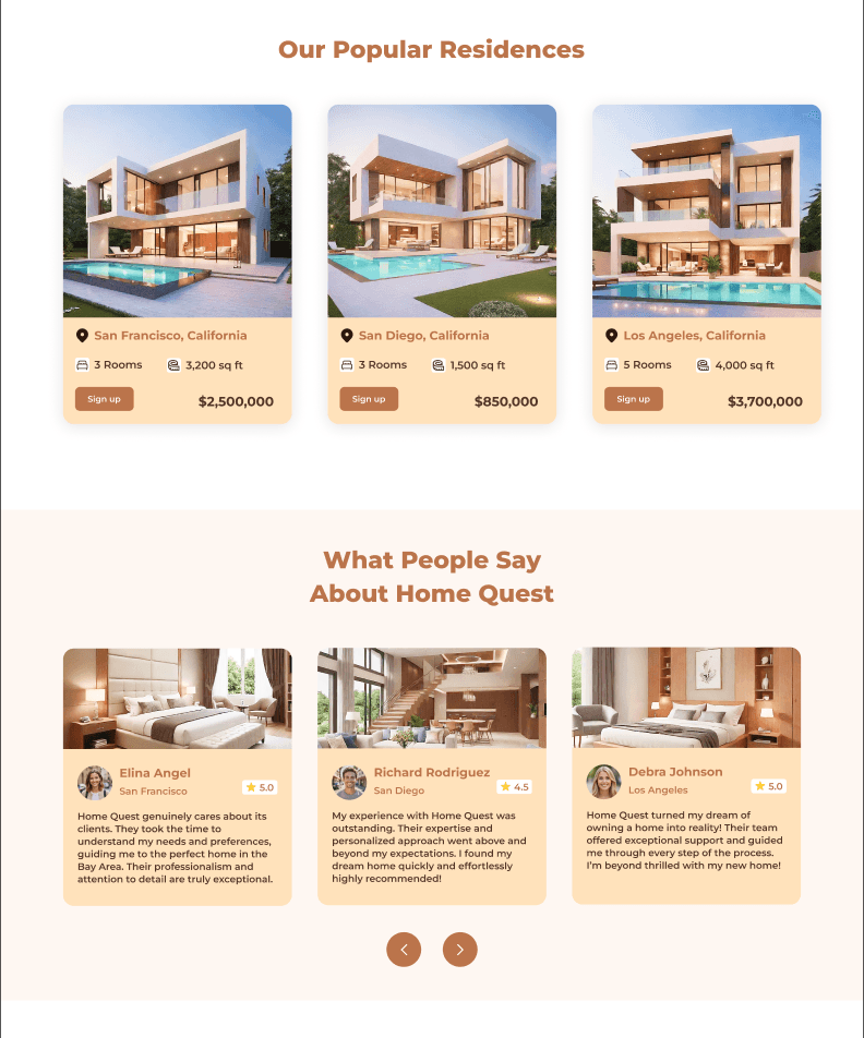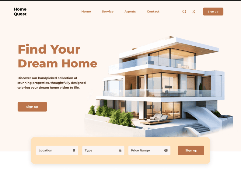HomeQuest is a modern real-estate website concept designed to help users discover properties quickly and comfortably. The goal was to create a trustworthy digital experience with clean visuals, clear navigation, and fast-loading listings.