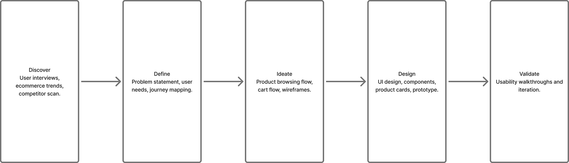 Outcome: Built a clean, responsive design system and simplified multi-step checkout flow, improving clarity during browsing and reducing friction during purchases.