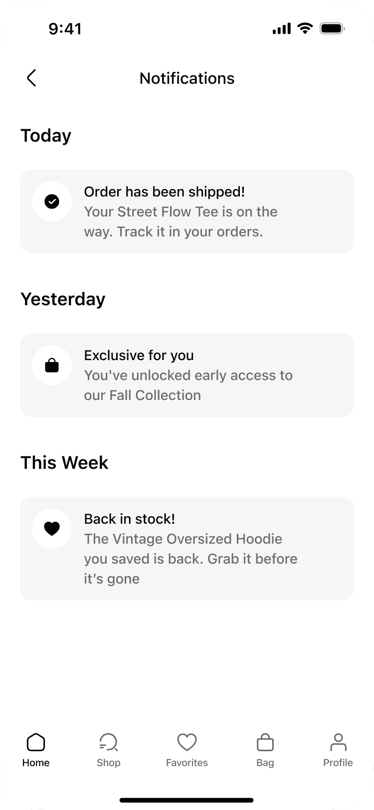 The streamlined layout emphasizes products, shortens the decision path, and reduces the number of taps to complete a purchase. The component system creates visual consistency across screens.